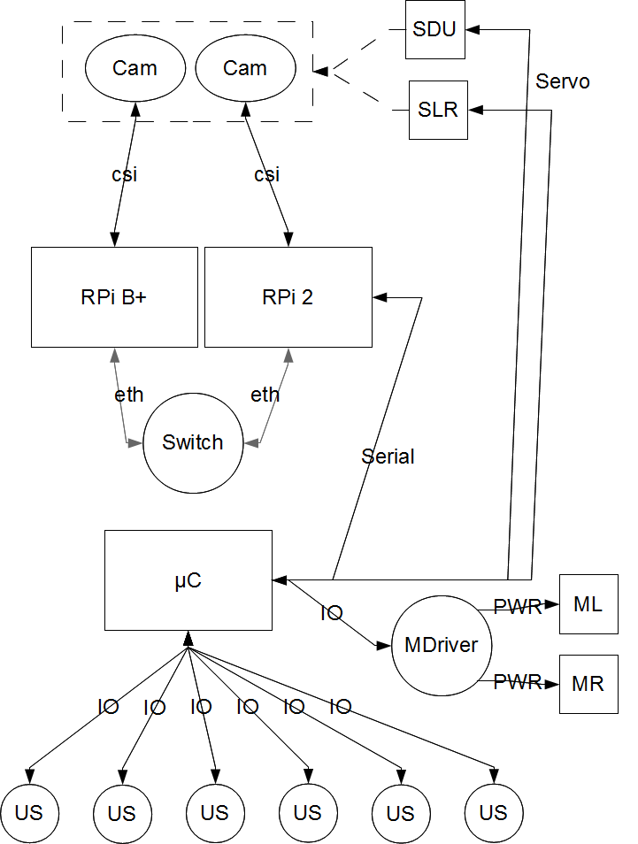 - Sensoren: US Sensoren (10x HC-SR04), PiCam (1x oder 2x), Pixy CMUcam5