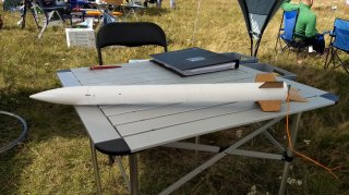05.2019 - in Peenemünde zweimal auf einem BC80 mit Peak gestartet, ca. 170m Höhe erreicht. Die zweite Landung war zu heftig, das Heckteil muss neu gemacht werden.