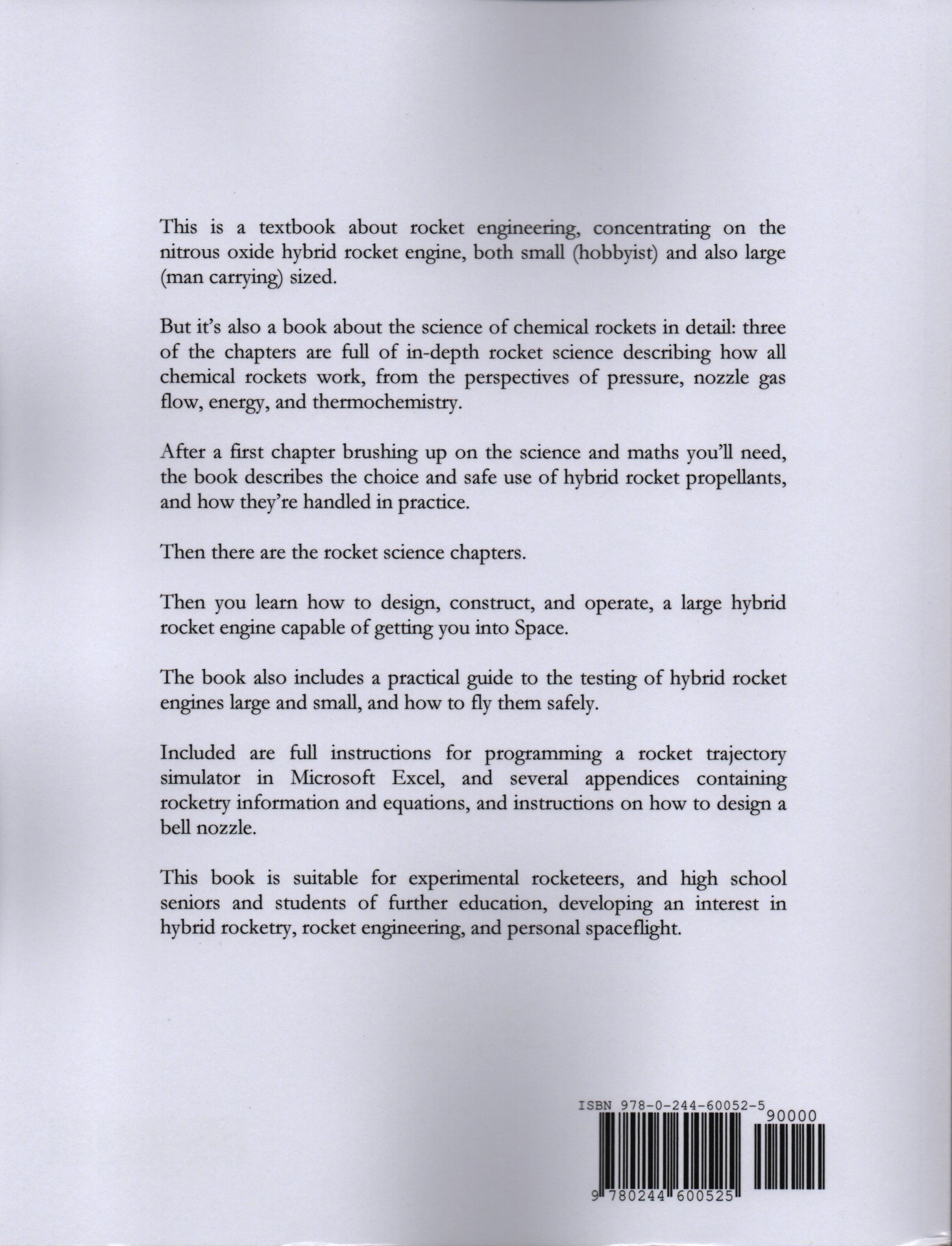 Dieses Buch beschreibt die unterschiedlichsten Versionen von Modellraketen. Es wird auch das technische Umfeld besprochen, Startrampe, Elektronik und die Physik. Es sind konkrete Bauanleitungen mit Teilelisten für verschiedene Modelle dabei, man beachte aber des er sich auf das amerikanische System bezieht. Ein weiterer Punkt ist das er auch auf Wasserraketen eingeht.