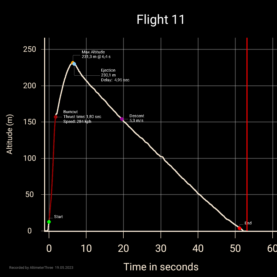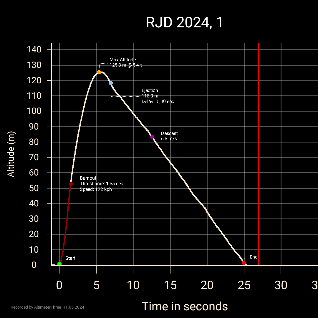 05/2024 - flog beim RJD2024 auf einem C6-5 mit einem 35cm Fallschirm, eine Höhe von 125m erreicht, sauber gelandet. Die Nutzlast war ein Altimeter Three von Jolly Logic.