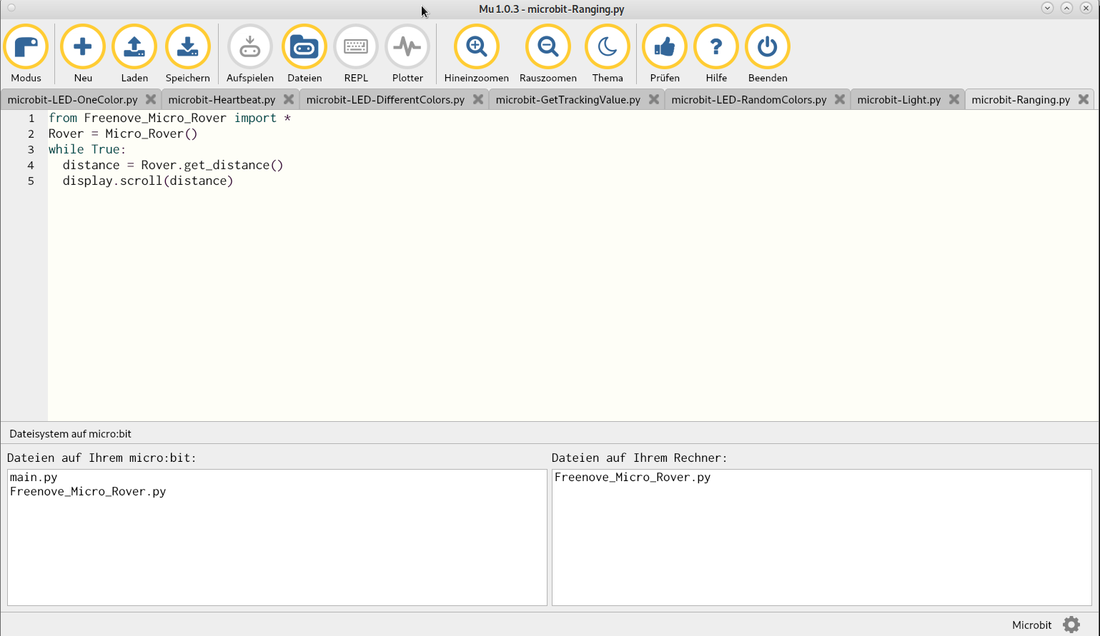 Die Anleitung bezog sich natürlich auf MS Code, wie ich sowas liebe. Ich verwende den mu-editor und da begannen die Probleme :D man muss wissen das die Bibliothek, Freenove_Micro_Rover.py, voher auf den micro:bit kopiert werden muss, dann ging auch alles. Die Bibliothek muss in das Verzeichnis '/home/user/mu-editor/' kopiert werden, dann kann man mit Hilfe von dem Dateimenü "Datei" kopieren, siehe Bild.