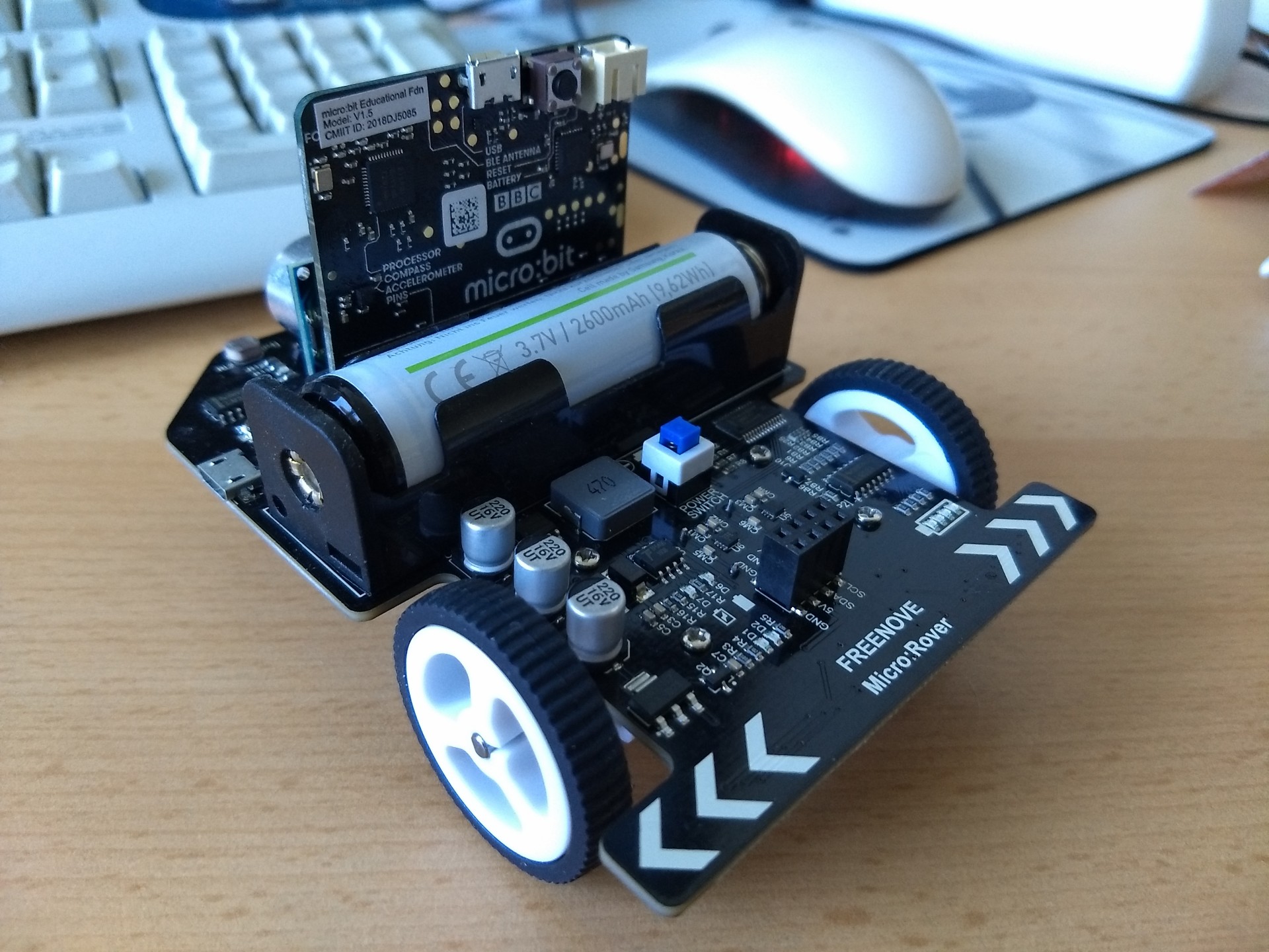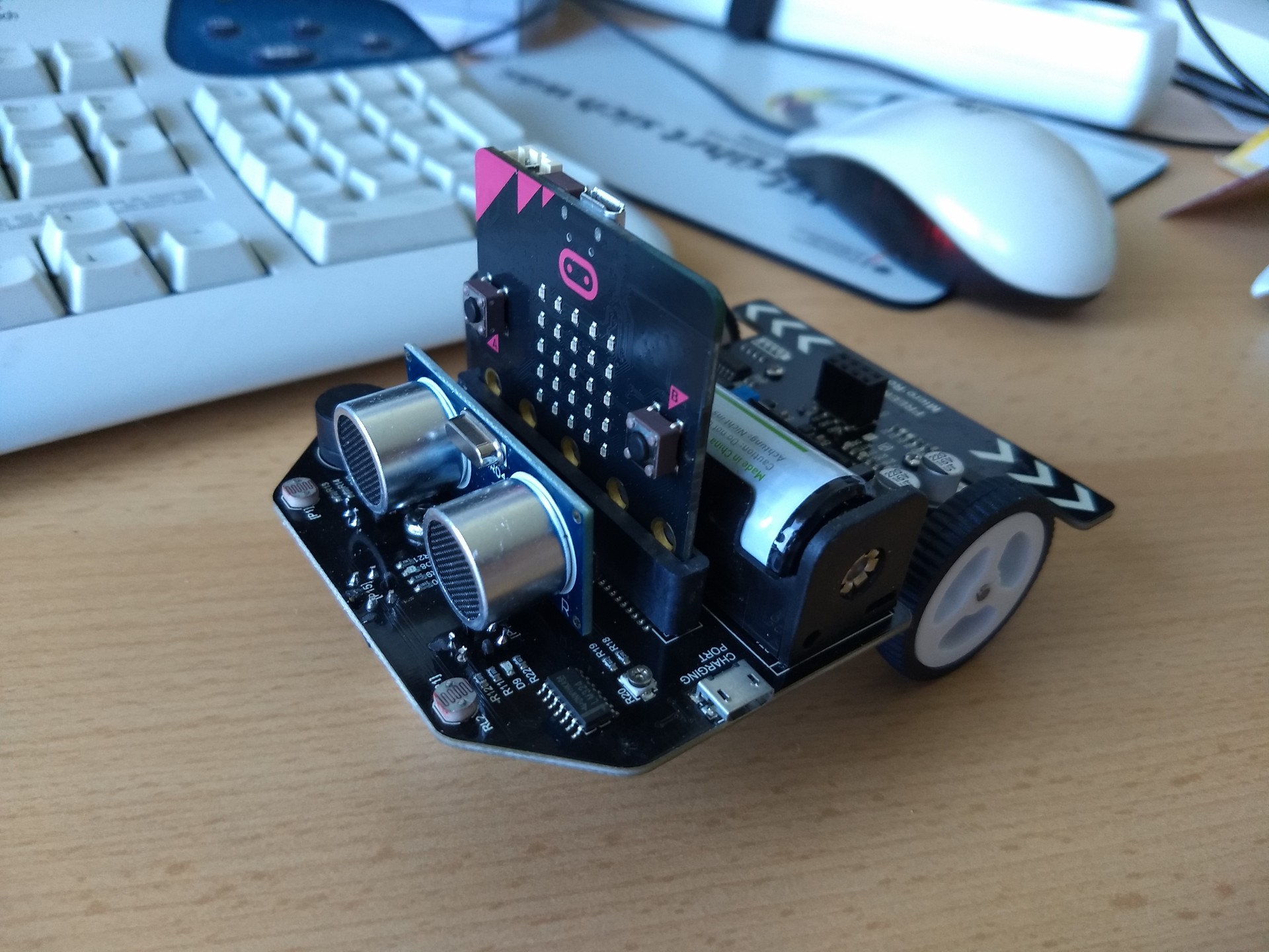 Das Teil (vorne, hinten) war fertig montiert in der Packung, nur noch LiPo Akku und micro:bit rein.