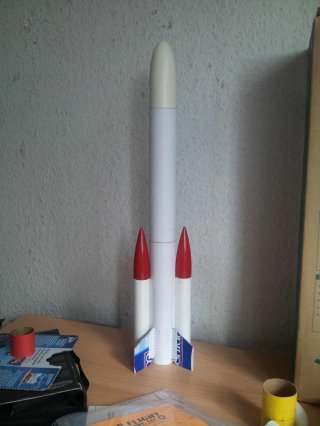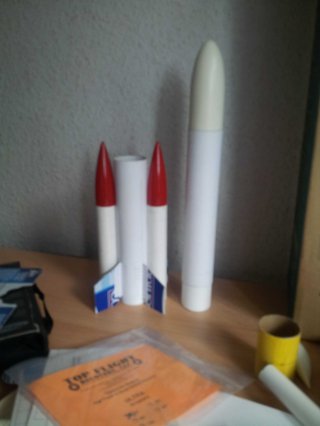 Die Teile sind zusammengesucht, die sind von Noris-Raketen aus Nürnberg. :-D 42mm stabiles Körperrohr und eine stabile Spitze. Der Antrieb wird ein Held5000 bzw. ein Solaris-Z 24 sein, damit sollte eine gute Höhe erreichbar sein. Zwei Booster (18/24 mm) sind auch noch möglich. Das Problem mit den Boostern ist, das man diese manuell berechnen muß, da dies zur Zeit kein Progamm sauber kann. Eine Startstufe (2/4 Motoren) soll die Modellrakete dann noch höher bringen.