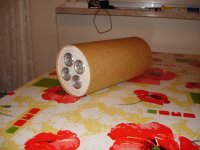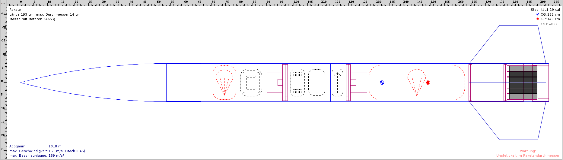April 2012 (Ostern) - Die erste kurze Variante wurde in einer Nacht zusammen gebaut. Ich hatte alles dabei, aber auf Grund einer Lieferschwierigkeit, hatte ich nicht das gesamte Bergungssystem dabei. Ich habe mir dann eine Variante ausgedacht, die mit einem Fallschirm und einem Kolben funktioniert. Die Motorhalterung ist jetzt eine symetrische Anordnung (2x2), insgesamt 4xBC125. Die BC125 können mit unterschiedlichen Reloads versehen werden.