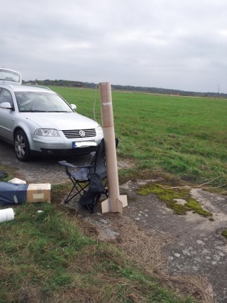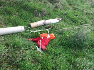 Oktober 2012 - Das Wetter war nicht so gut. Am Samstag war an starten nicht zu denken, Sonntag war das Wetter dann besser. Die kurze Magnum ist am Sonntag geflogen. Als Antrieb habe ich zwei Stirnbrenner mit Peak verwendet. Sie flog gut, tat sich beim Start aber etwas schwer. Stirnröhrenbrenner wären besser gewesen, aber sie kam auf 120m. Der Auswurf des Bergungssystemn erfolgte etwas zu früh, aber es ging noch. Die Landung erfolgte leider auf der Start/Landebahn (Beton), durch den Wind nahm die Modellrakete eine Schräglage eine und schlug mit einer Flosse auf. Dieses beschädigte die Hecksektion und der Wind zog die Rakete noch 1km weiter bis ich ran war. Da wissen wir mal wieder warum es Sport genannt wird. Ich muß die Hecksektion komplett neu machen, sie wurde zu stark beschädigt. Bericht